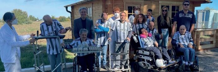 Nella foto di gruppo alcuni ospiti davanti al capanno insieme al dottor Eduardo Teodorani Fabbri e l’assessora ai servizi per le persone del Comune di Cesena Carmelina Chicca Labruzzo, nella giornata in cui hanno regalato agli ospiti le maglie ufficiali della Jueventus.
